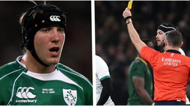 Referee Matthew Carley was heavily involved throughout the clash, issuing six cards in total — five to Ireland and one to South Africa. Ireland’s James Ryan received the first card of the evening after a high-impact collision at a ruck was upgraded from yellow to red following a bunker review.